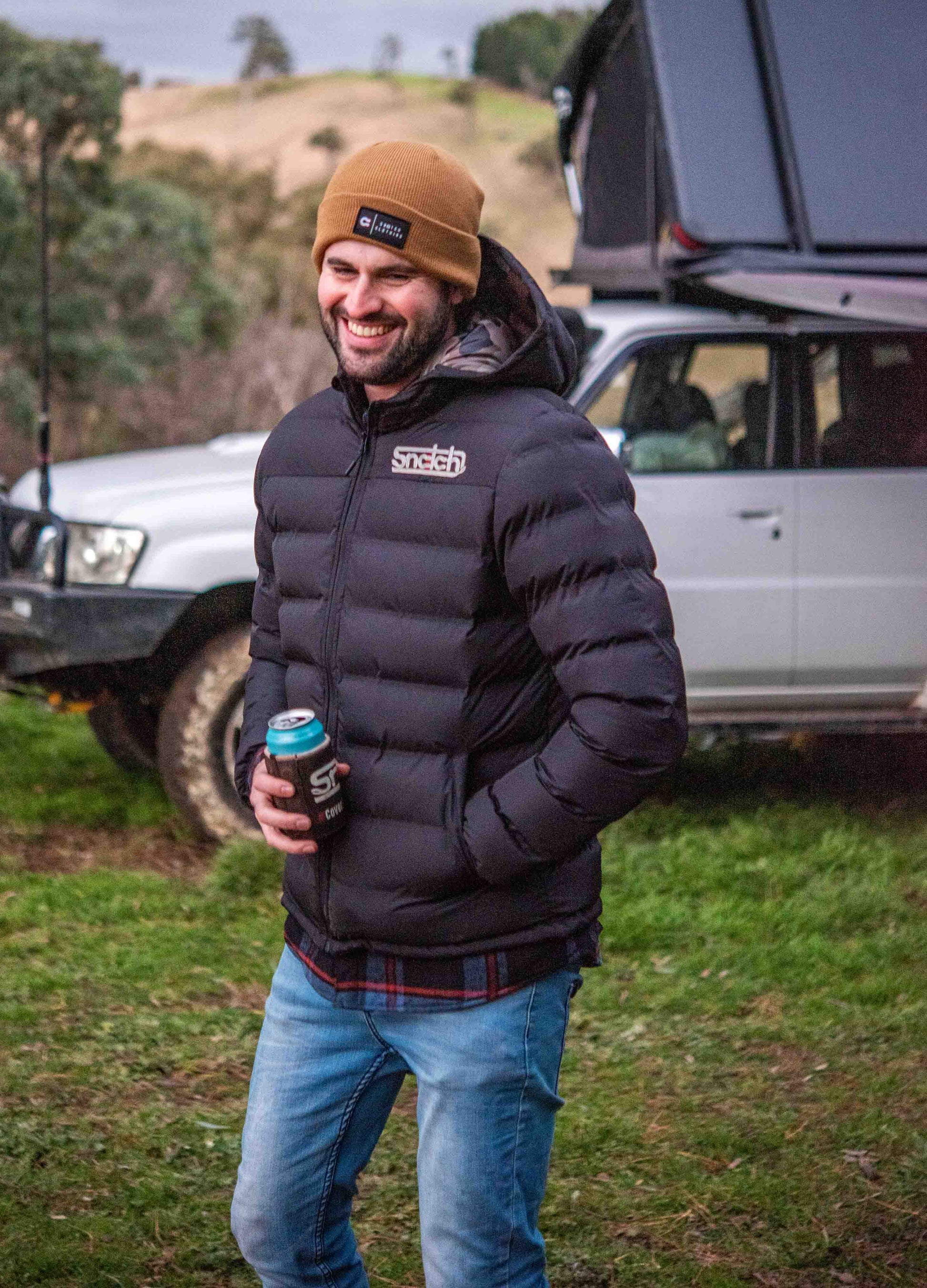 The wide channel puffer jacket has a black outer with army green yardage-printed camouflage inner lining, it's quilting is welded together and insulated with Dupont Sorona which is a lightweight, breathable insulation. Also featuring fleece-lined handwarmer pockets to keep your hands toasty warm, 2 internal pockets to keep your valuables safe, and an insulated hood to keep your head warm and dry through any conditions. Weve also included vintage-style chain stitch Snatch logo embroidery on the left chest and on the back too.